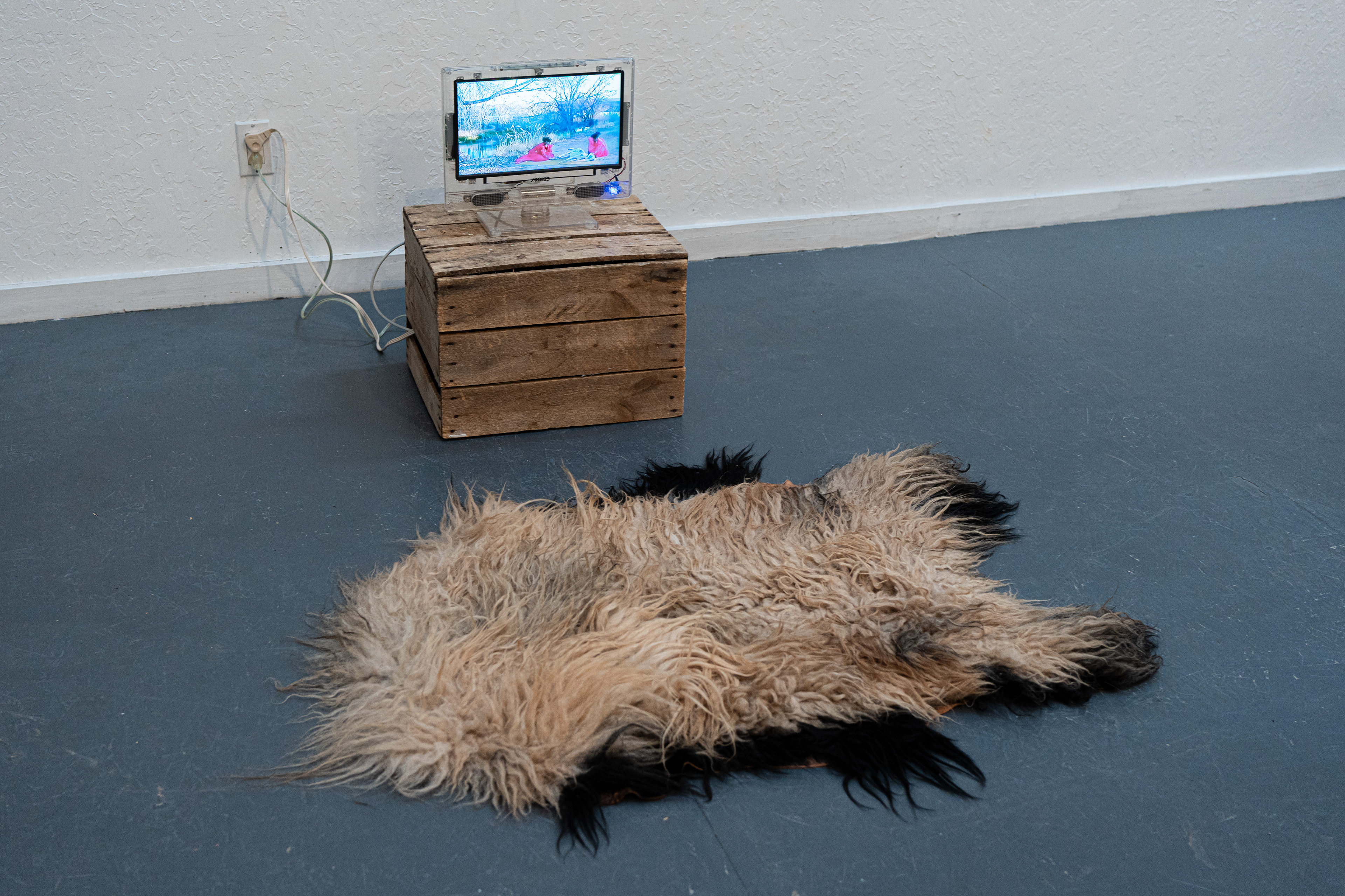 materials: seed broadcast newspapers made into puppet with bamboo from my yard, painter’s tape, and a white cloth of unknown origin. red dress ripped from moshing and a thick cotton clown coat found at a garage sale in willits. months of studying deep puppetry, separately and together. a sheepskin from my friend’s flock. fen’s panasonic pv-dv900 digital camcorder. clear prison television sourced from ebay. wood box acquired while buying old blues records off craigslist six years ago. film sped by 500%, a technique drawn from work i made ten years ago. sound and video recorded where the i-40 meets the rio grande.