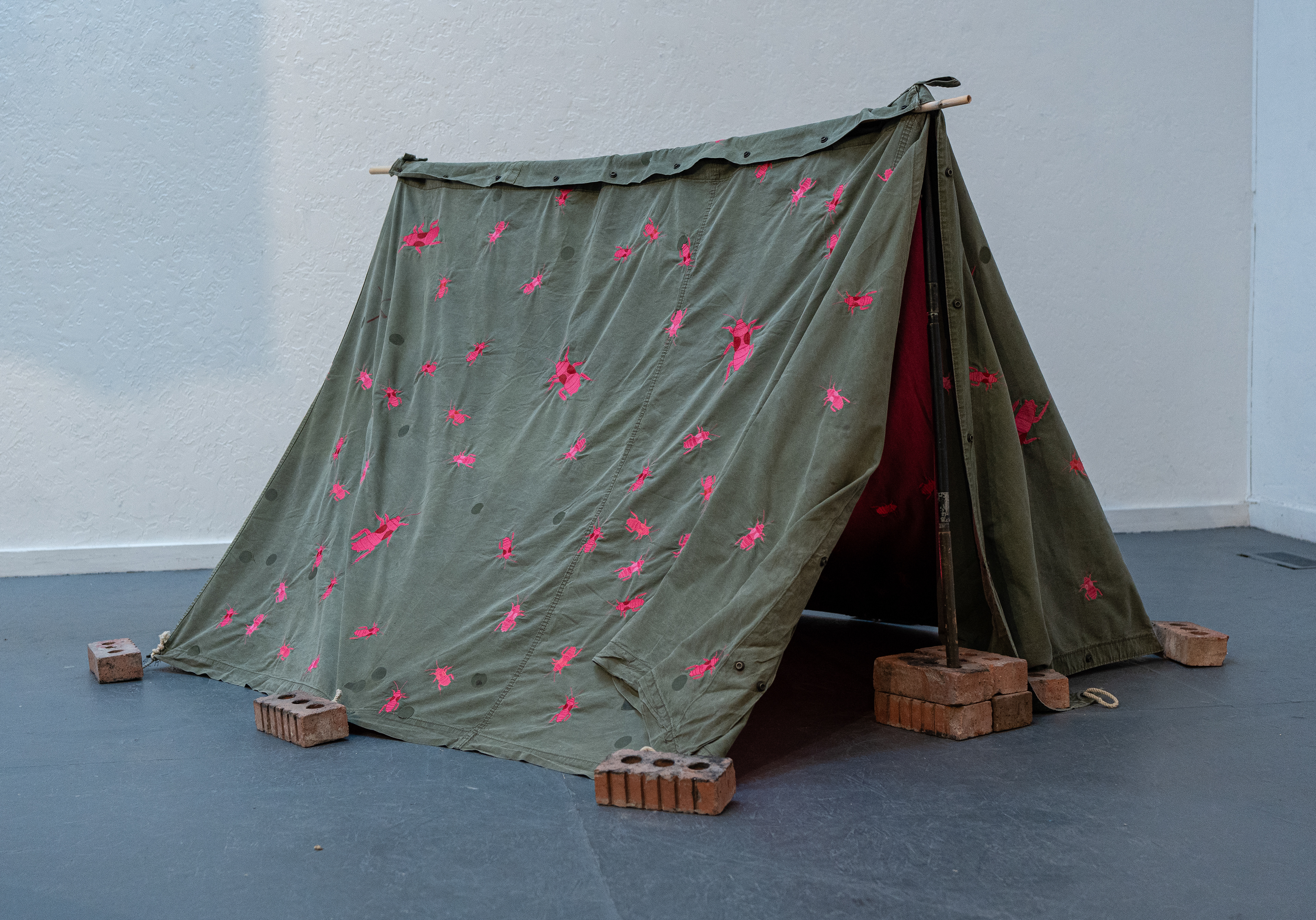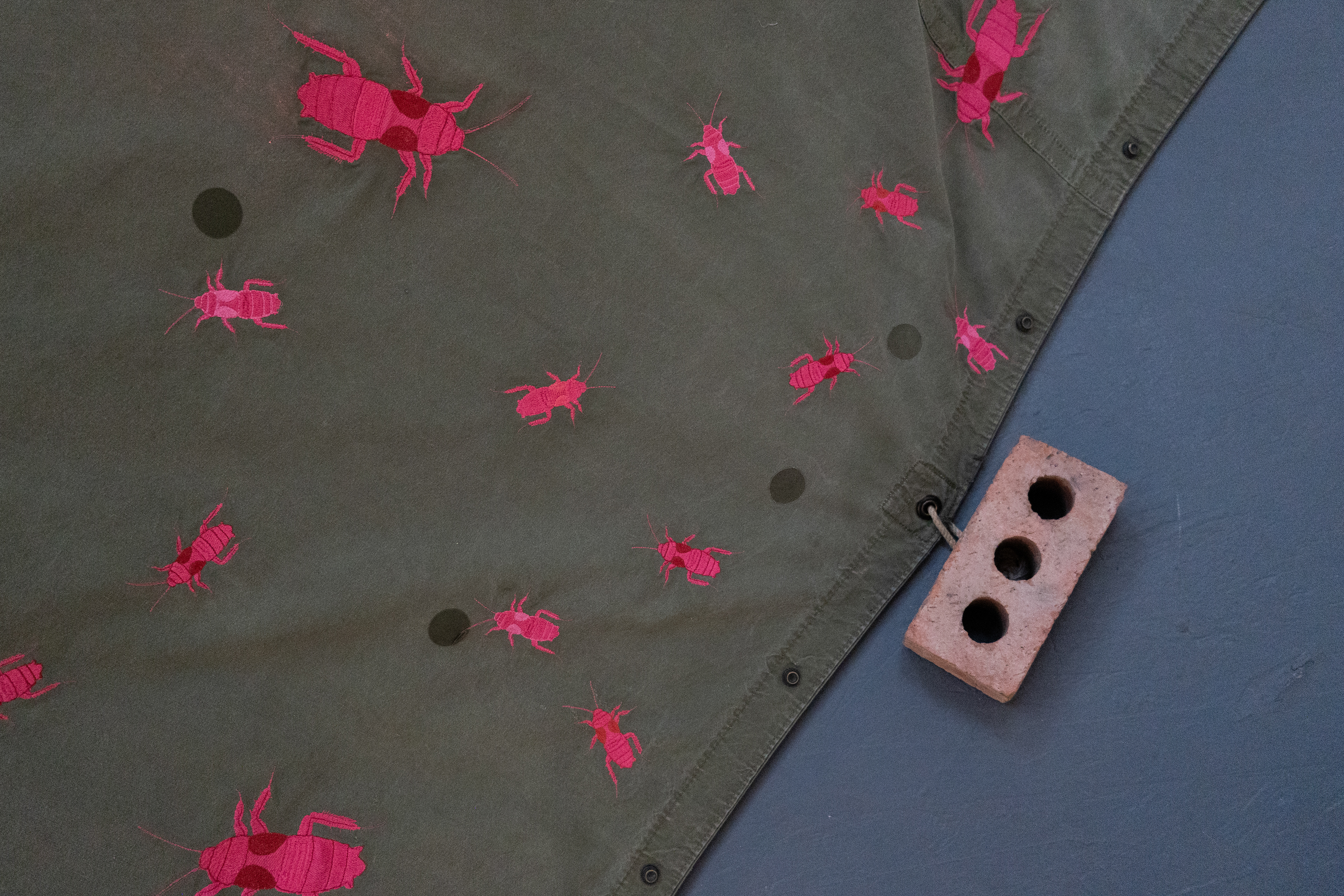 materials: old canvas tent from an online military surplus store. matte embroidery thread purchased 50% off at ryan’s sewing and vacuum center in albuquerque. three dollar embroidery design downloaded, re-coded, burned to floppy discs, then stitched on a 1998 husqvarna viking designer I sewing machine; a machine found on craigslist six years ago and exchanged behind the mcdonalds in truth or consequences near the large trash bins. red-clay cored bricks hauled from behind a house in old town, where sage tipped me off. lightbox built by my dad in 1980, given to me as a teenager when i shot film. rock and bamboo sourced from my yard in albuquerque. 109 small cockroaches––twenty minutes embroidery time each; 13 large cockroaches––one hour embroidery time each. machine malfunctions. pink plastic transparency.