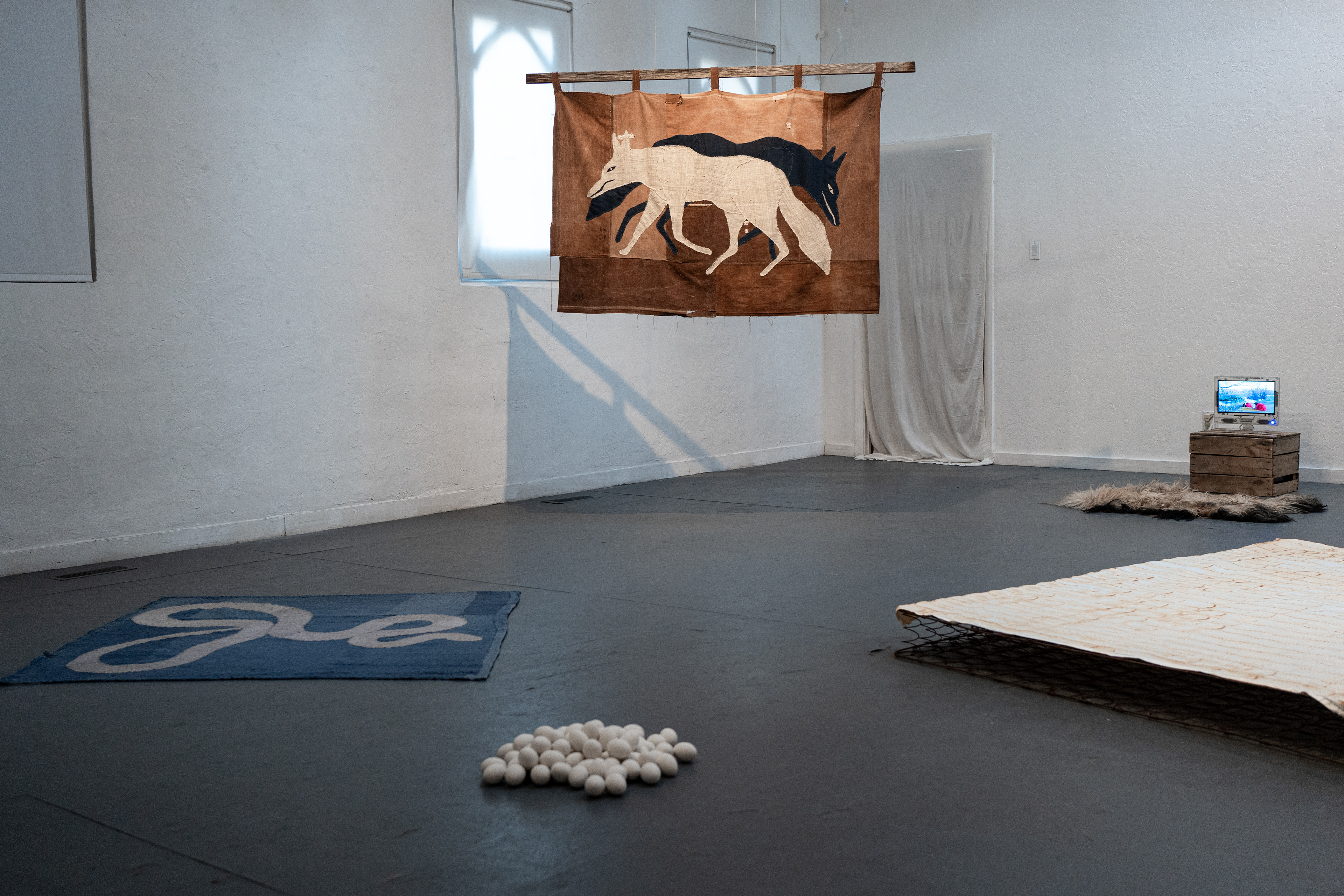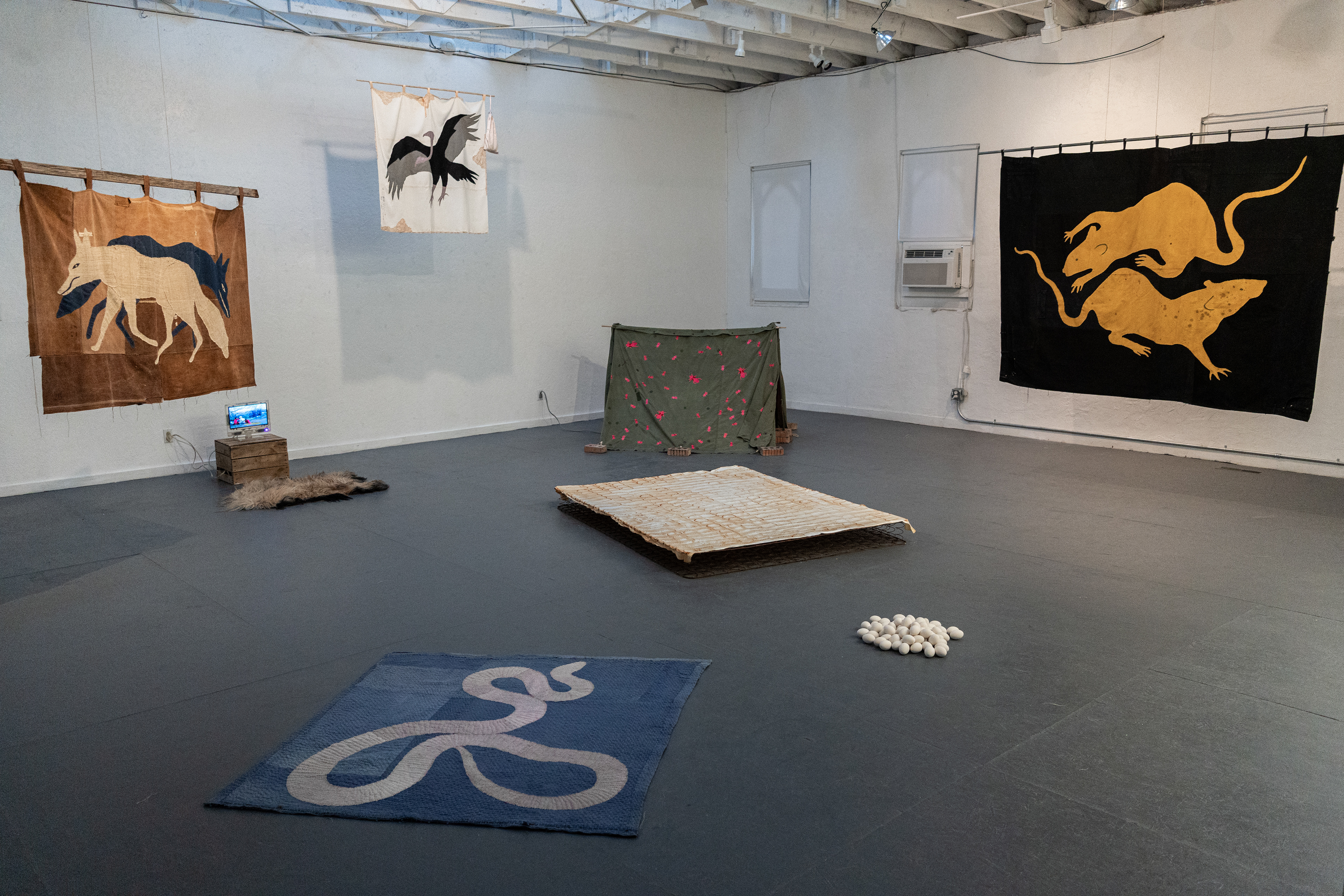 The animal scavengers (and other less-definable forms) I depict operate on the margins, much like the materials and ideas I work with. This approach draws from experiences and values shaped by queer, punk, and other subcultural spaces, where scavengers are often celebrated for their adaptability, resourcefulness, and capacity to thrive within the gritty worlds of garbage, death, and decay. It’s near impossible to go to a punk show without seeing at least one possum stitched to a jacket or bum flap. Symbolically and literally, these animals resist the death-machine of imperialism: they reclaim what has been ‘othered’ or left to rot and transform it into nourishment. In centering these overlooked beings and materials, my work interrogates structural violence and amplifies enduring agency. Through this process, I transform the memories and materials I’ve gathered into objects alive with protection, guidance, and warmth.